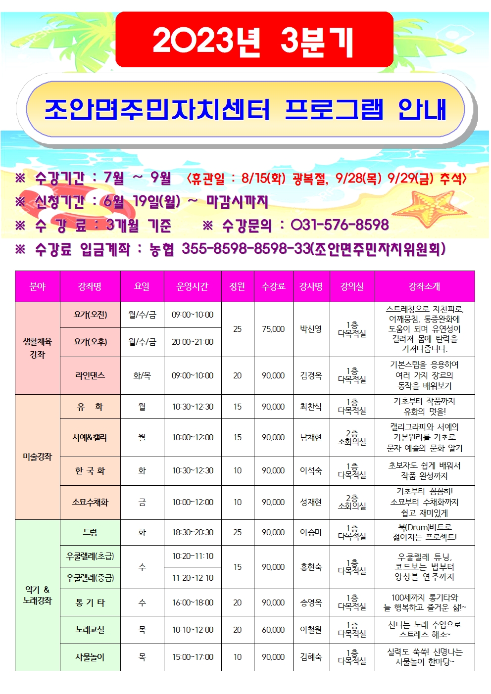 2023년 3분기(7~9월) 조안면주민자치센터 수강생 모집