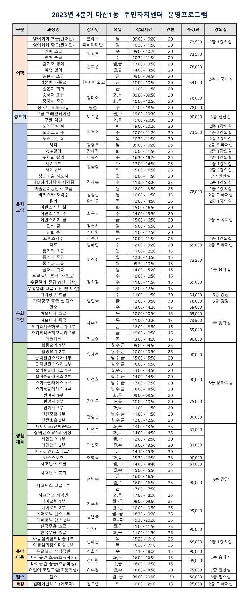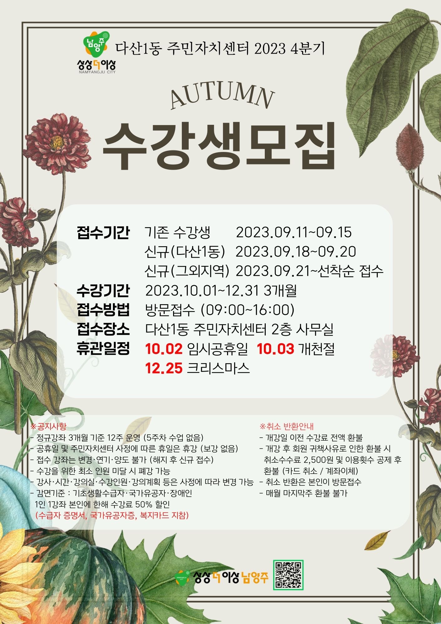 2023년 4분기(10월~12월) 다산1동 주민자치센터 수강생모집