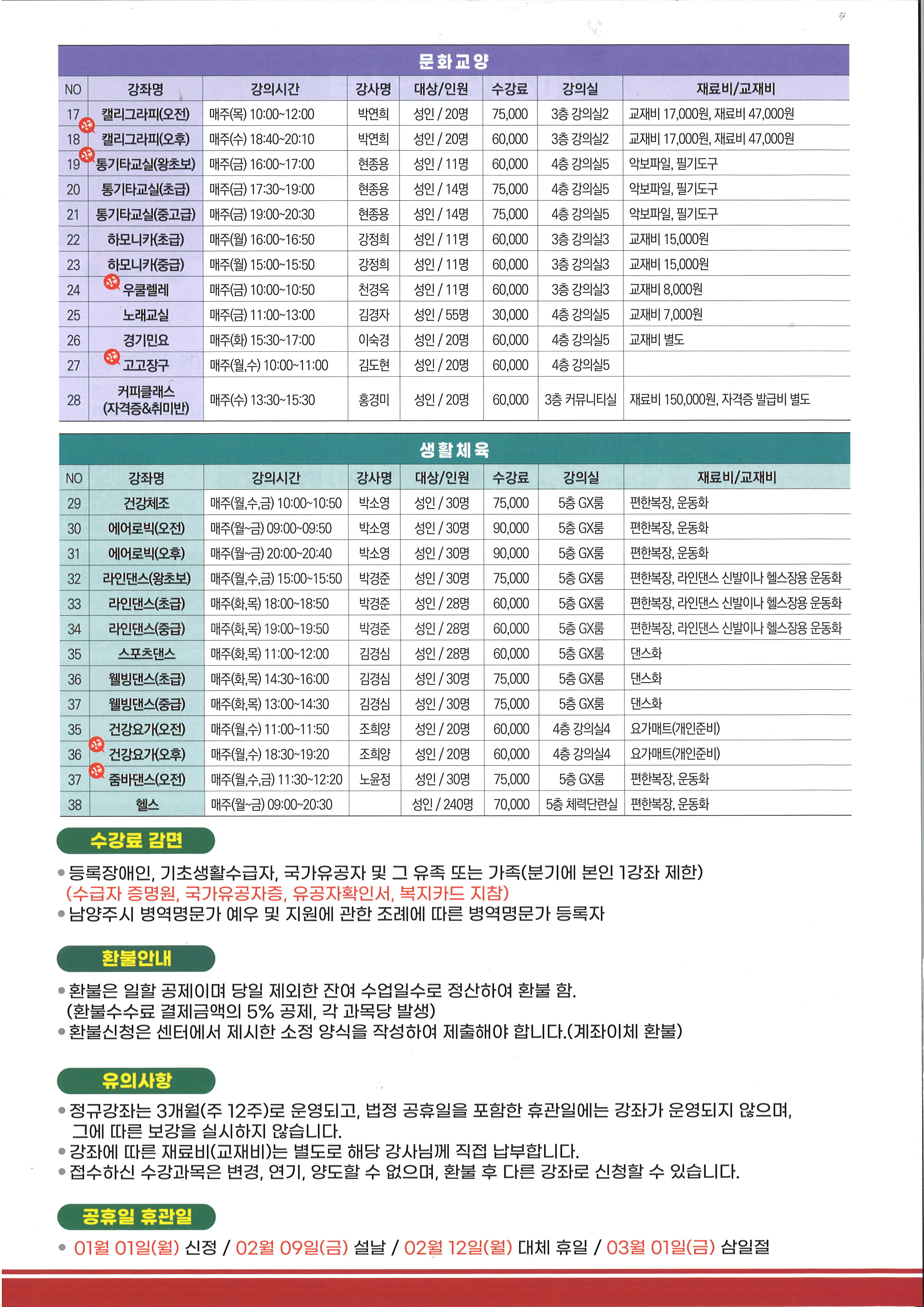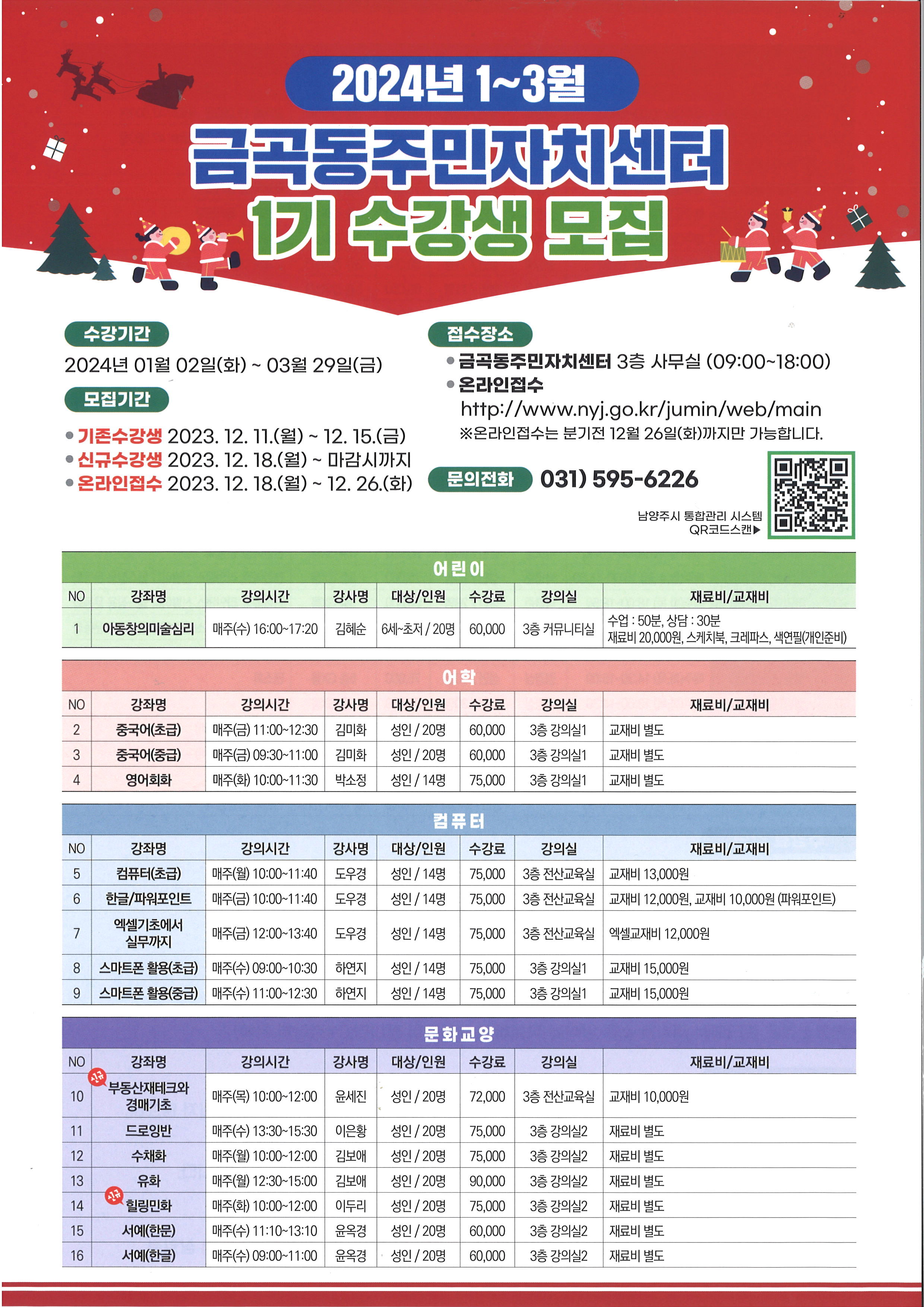 2024년 1분기(1월~3월) 금곡동주민자치센터 수강접수 안내