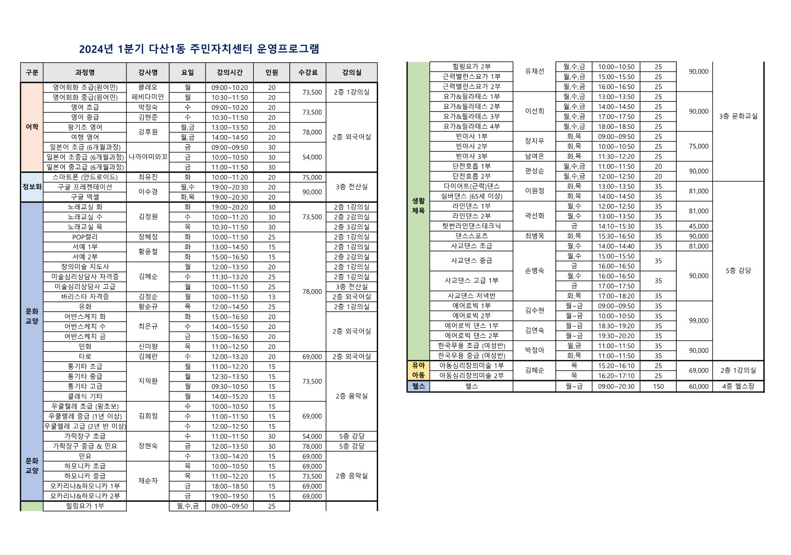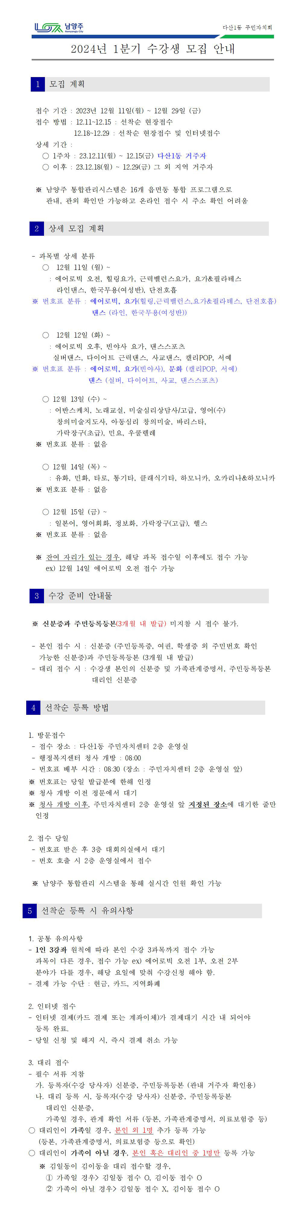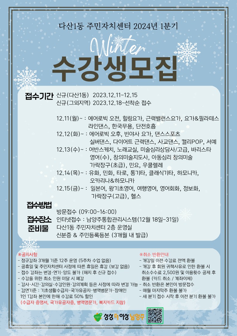 2024년 1분기 다산1동 주민자치센터 수강생모집 안내