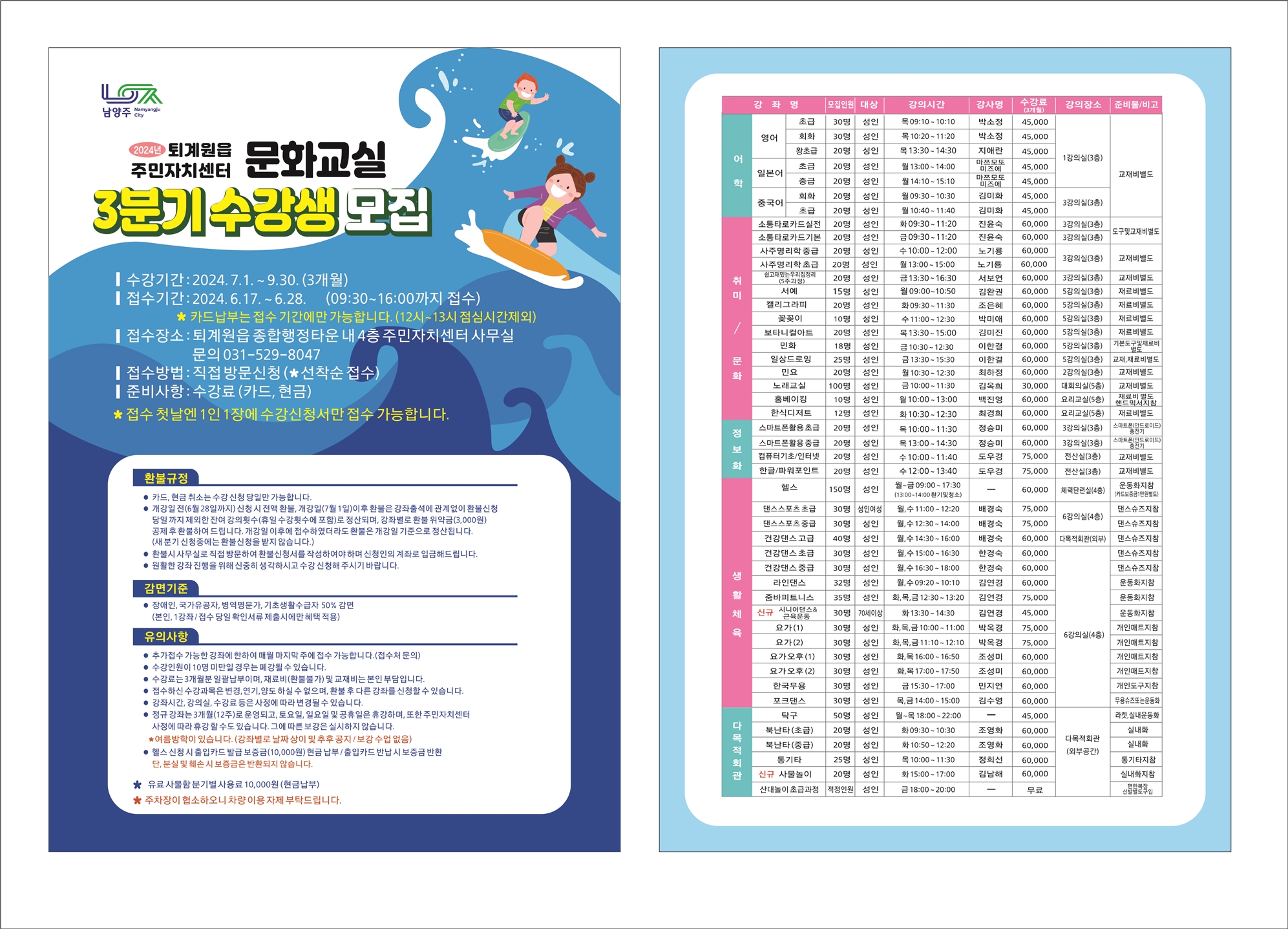 2024년 3분기 퇴계원읍 주민자치센터 문화교실 수강생 모집