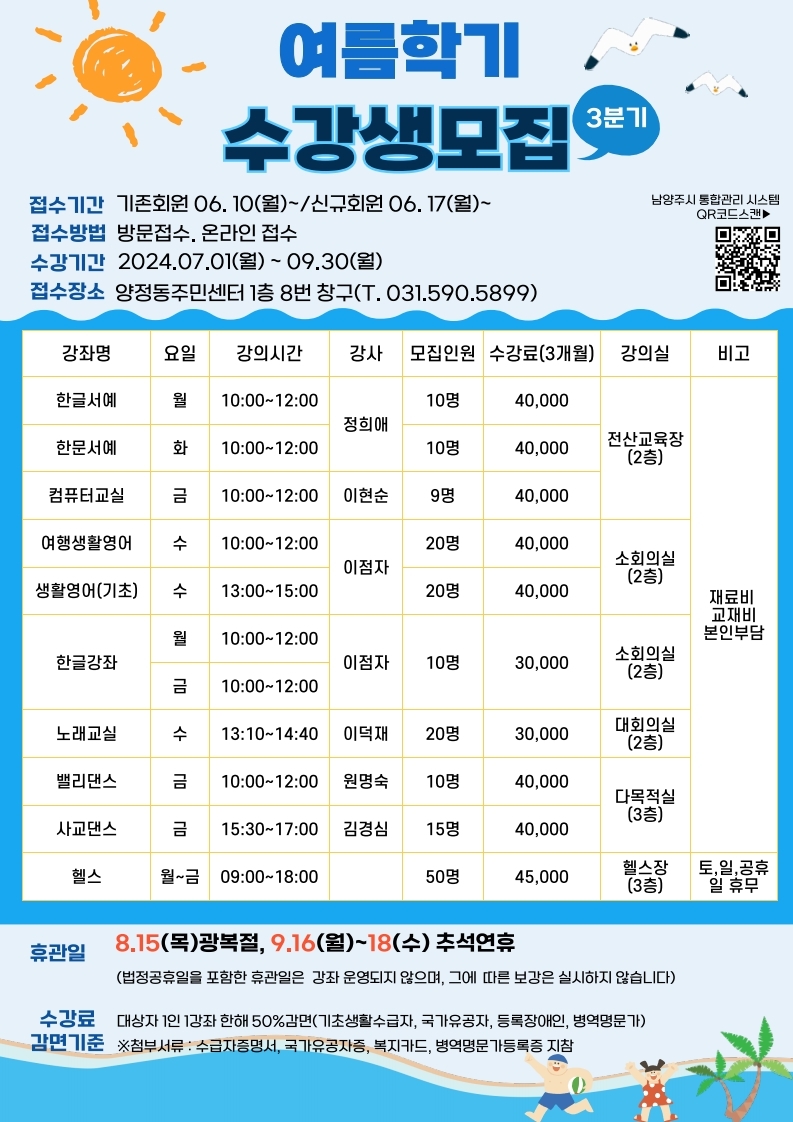 2024년 3분기(7월 ~ 9월) 양정동 주민자치센터 수강생 모집안내