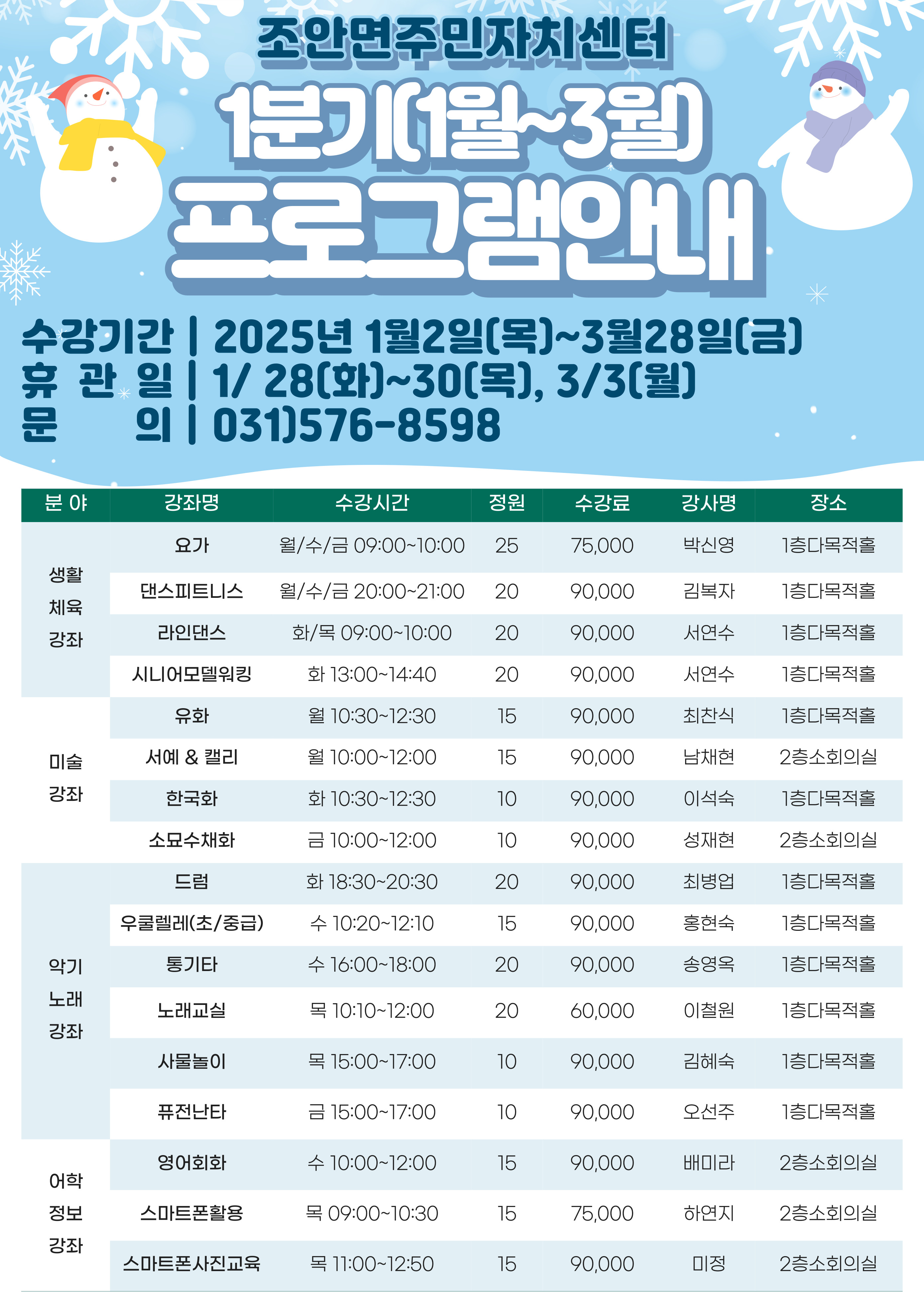 2025년도 1분기(1월~3월) 조안면주민자치센터 수강생 모집안내