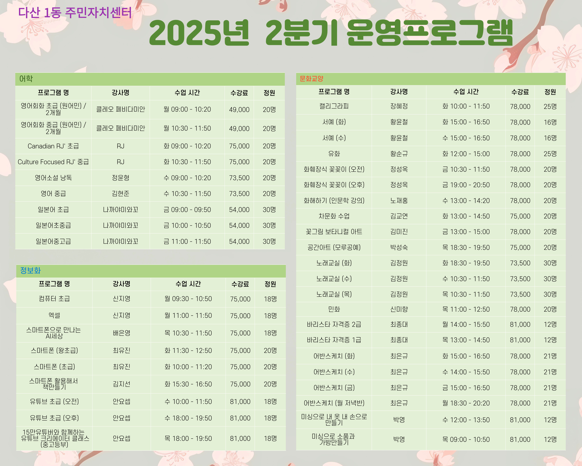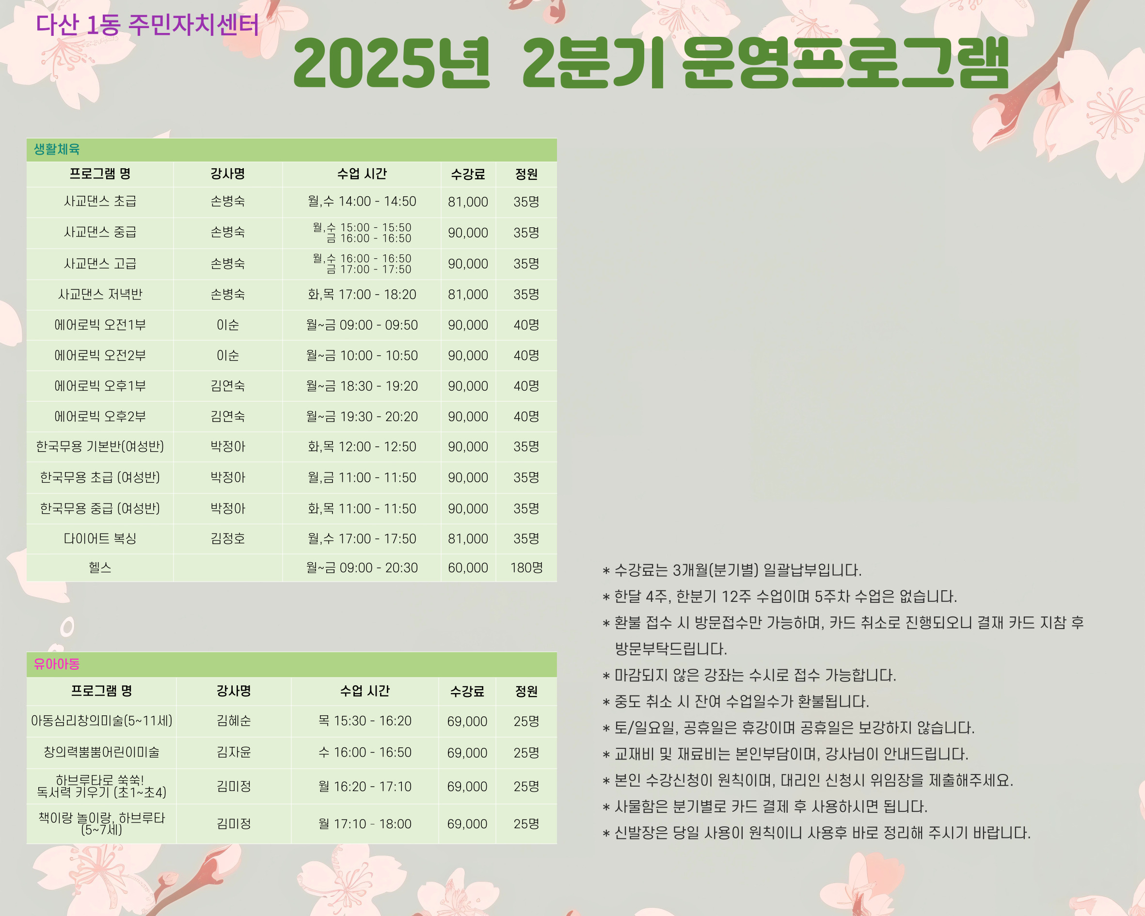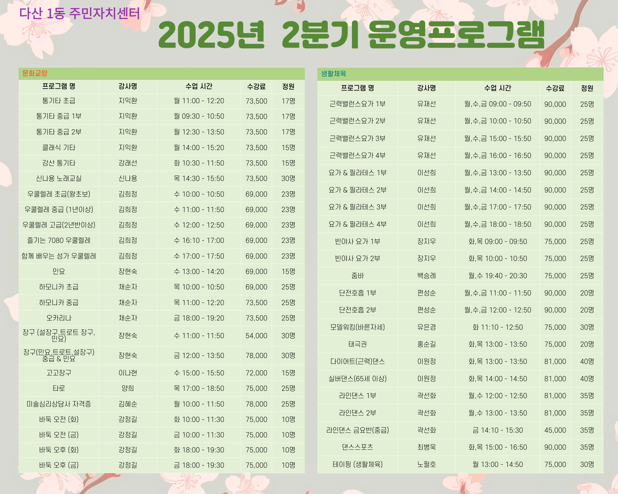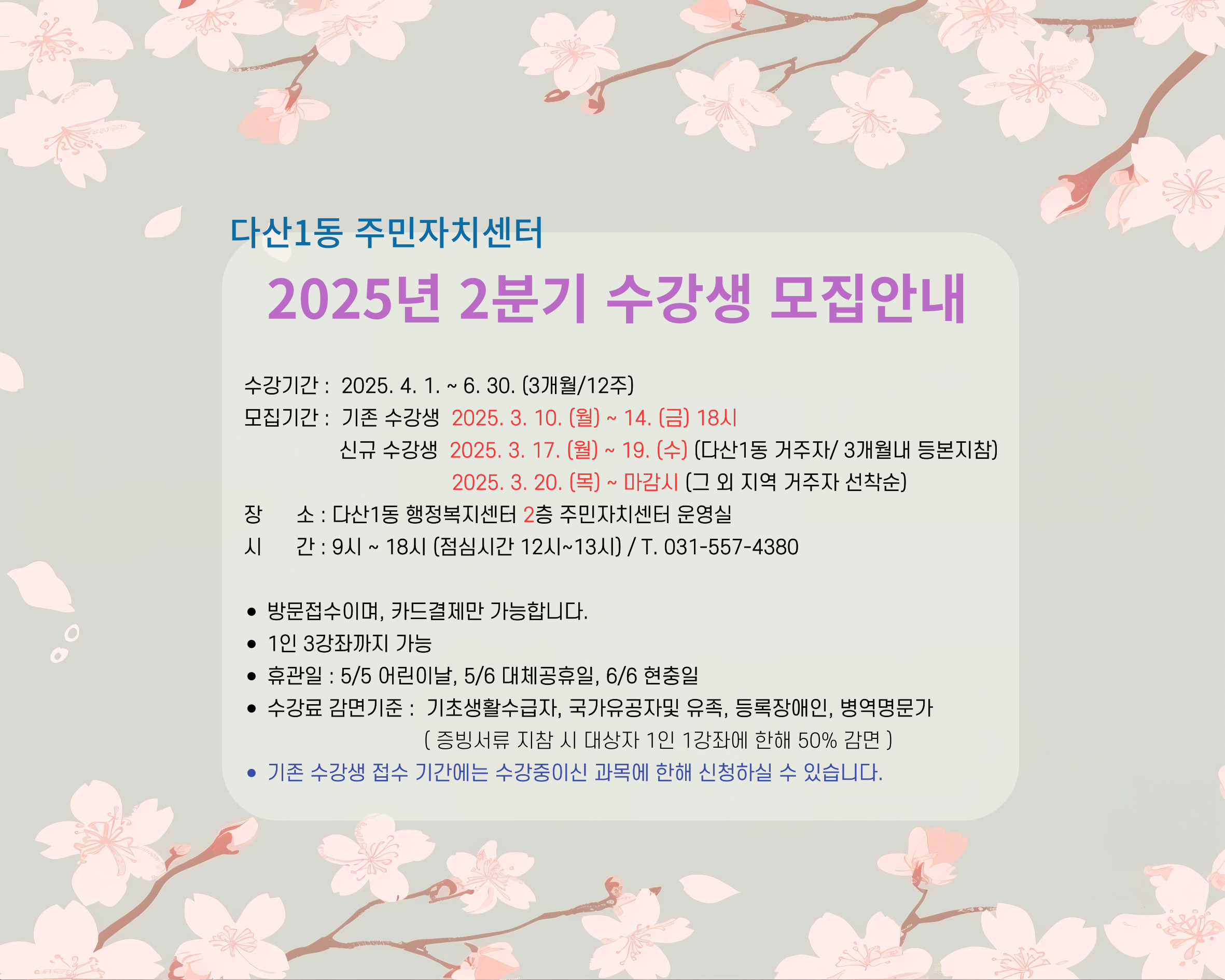 2025년 2분기(4월~6월) 다산1동 주민자치센터 수강생 모집