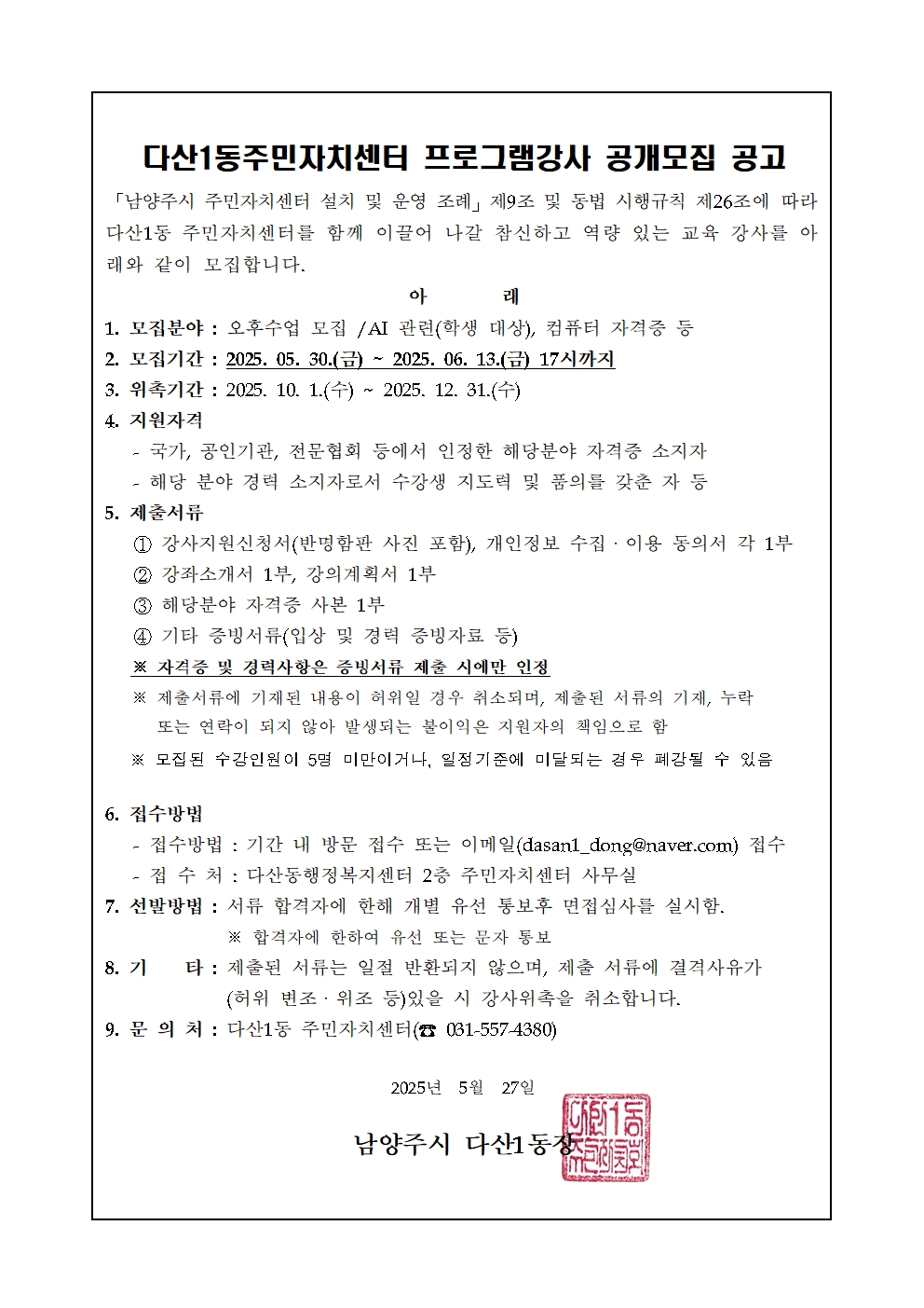 2025년 다산1동 주민자치센터 강사 모집 공고
