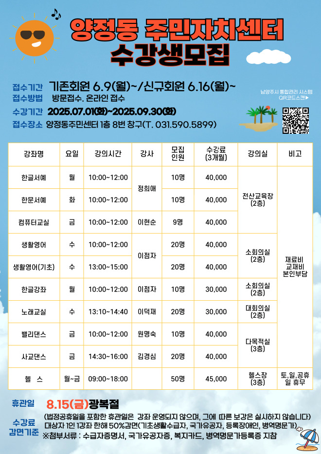 2025년 3분기 (7월 ~ 9월) 양정동 주민자치센터 수강생모집
