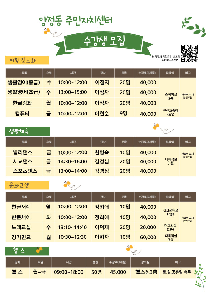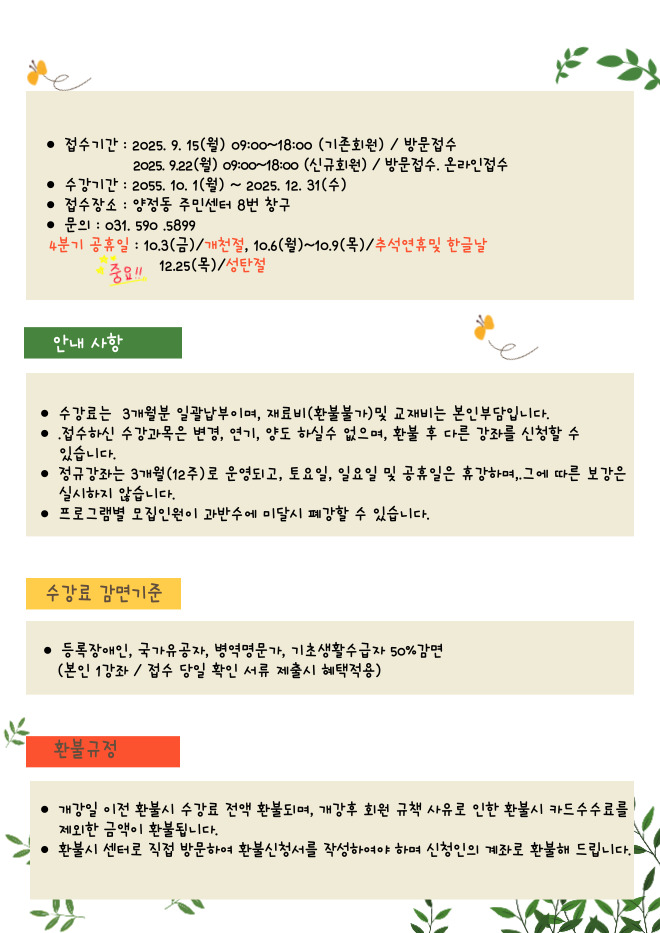 2025년 4분기(10월~12월) 양정동주민자치센터 수강생 모집