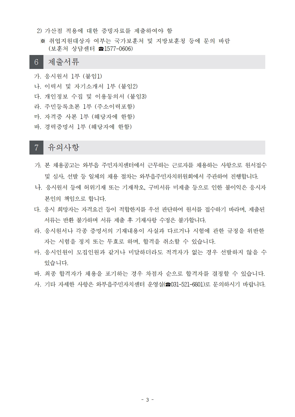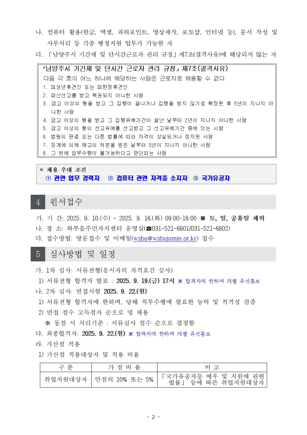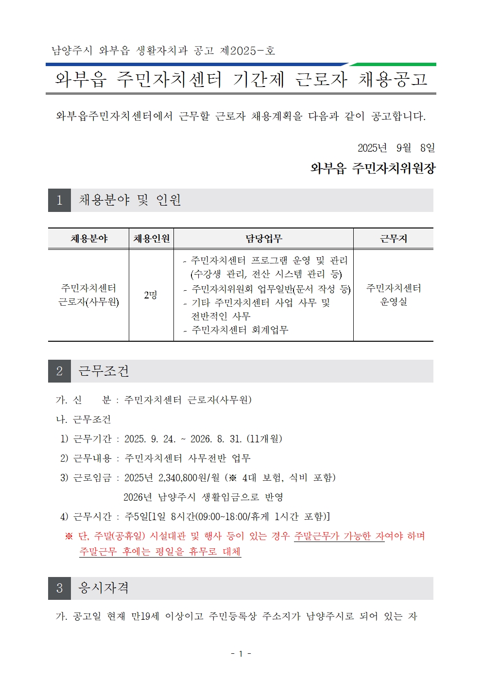 2025년 와부읍주민자치센터 기간제 근로자(행정 사무원) 채용공고