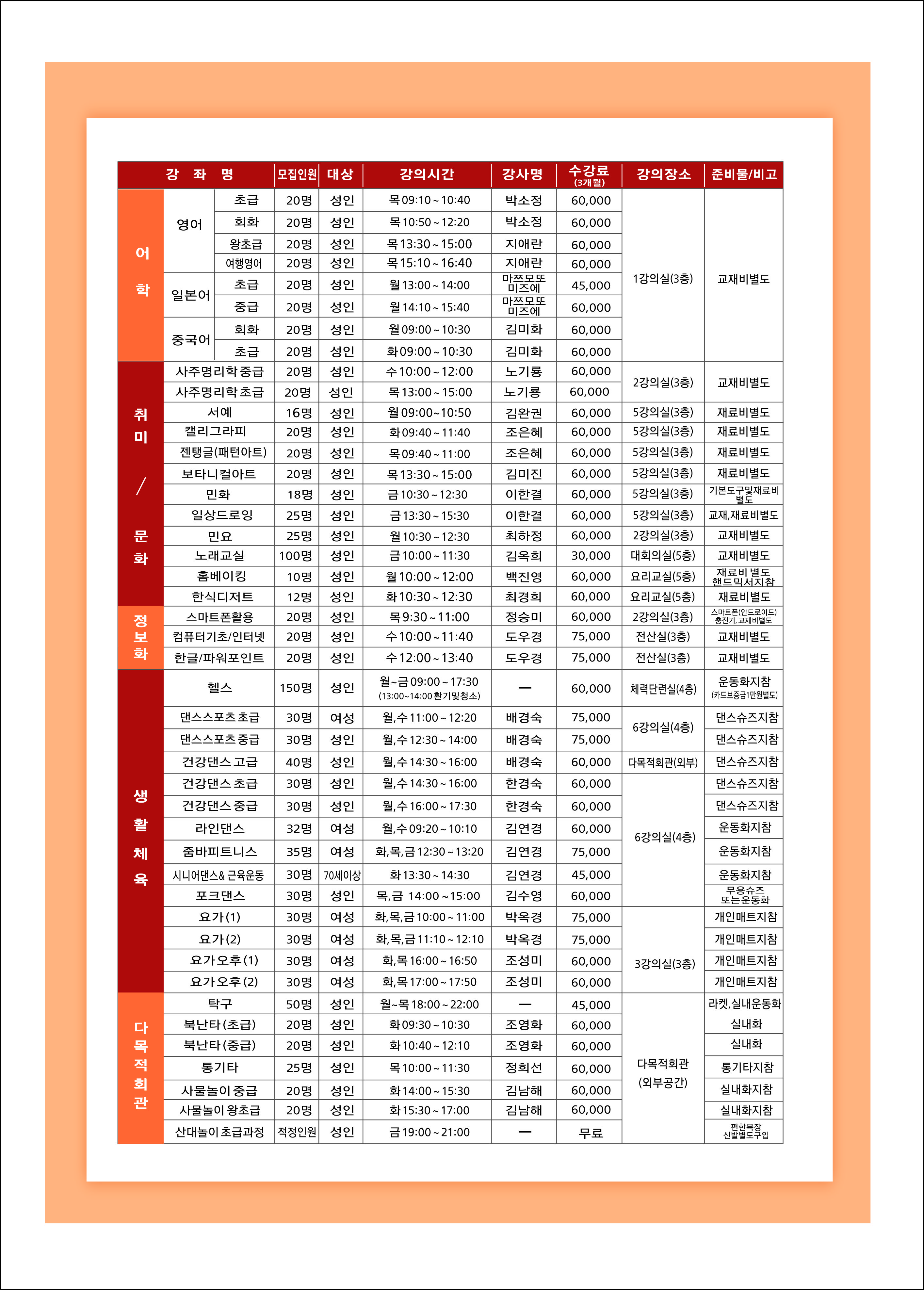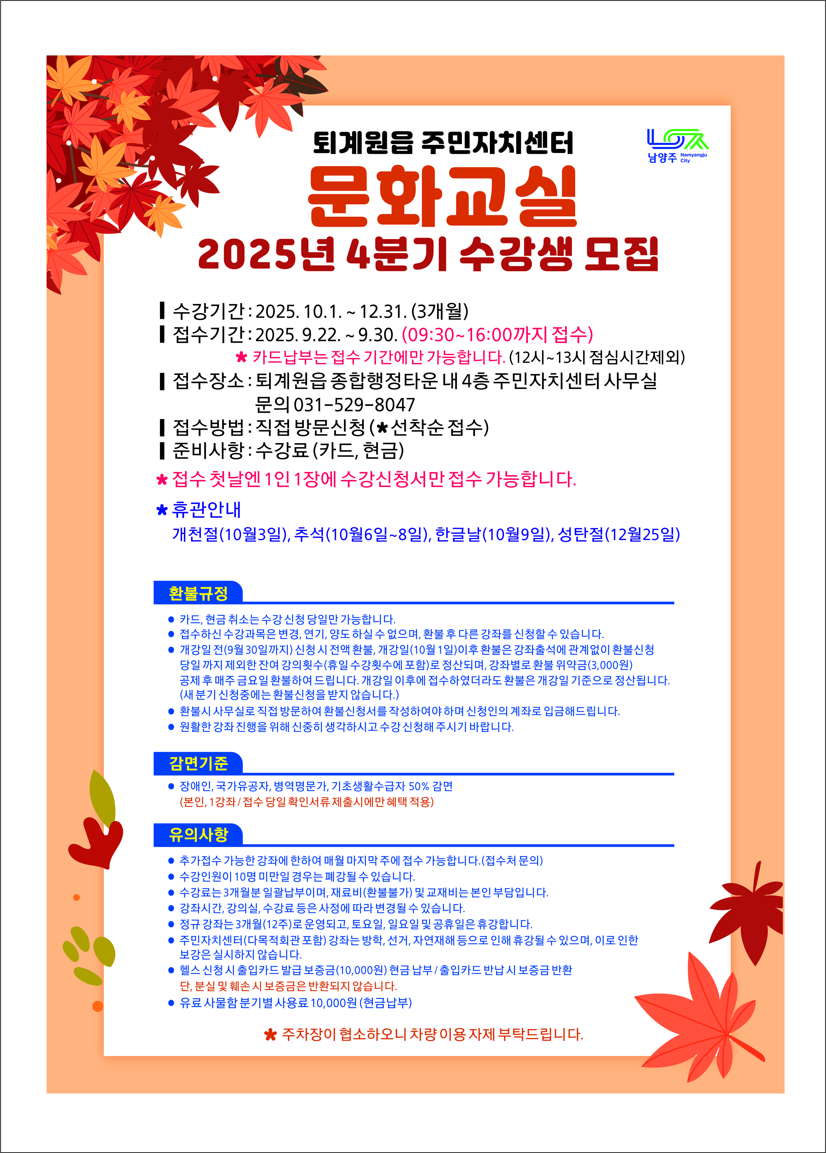 2025년도 4분기(10월~12월) 퇴계원읍 주민자치센터 수강생 모집안내