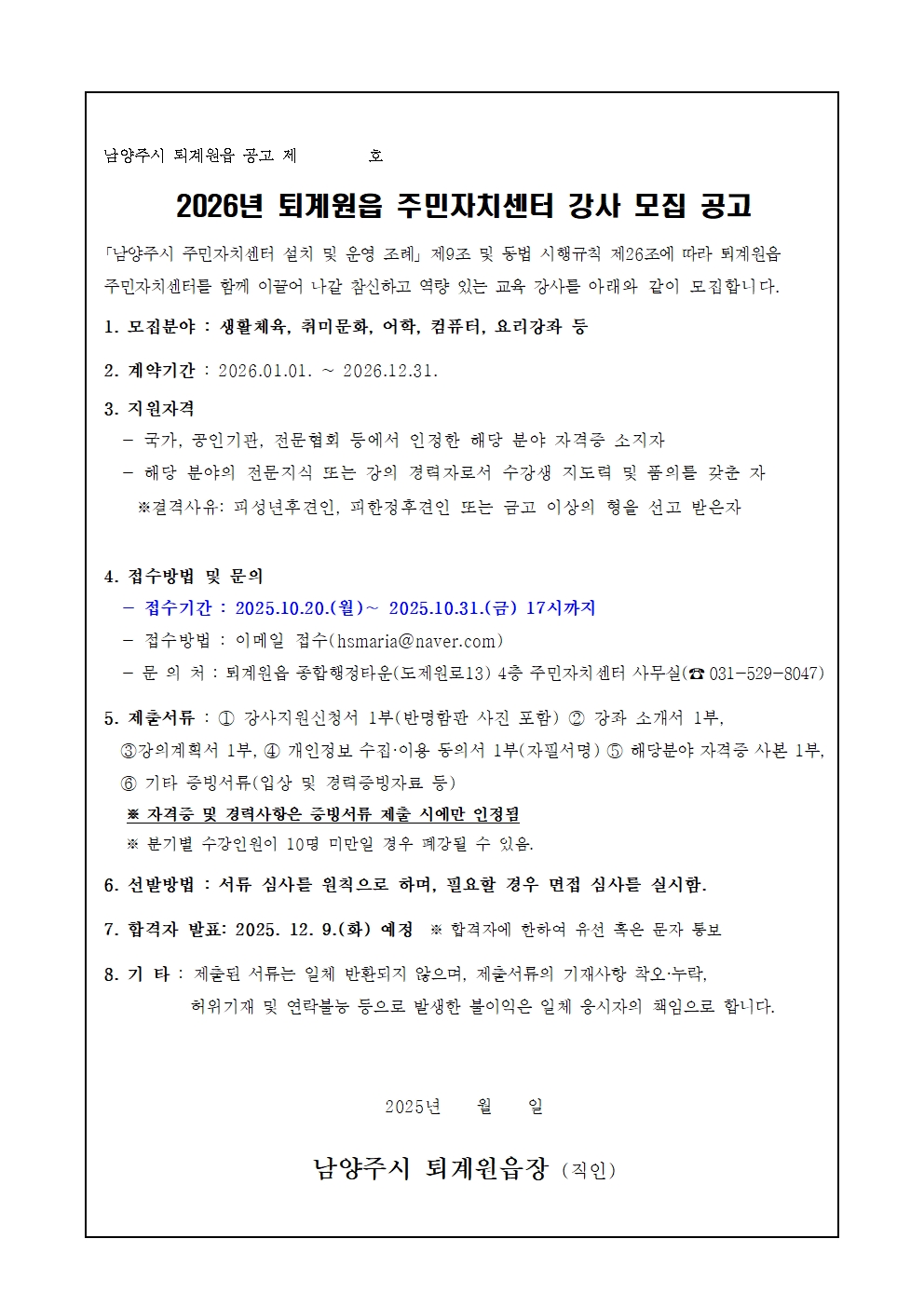 2026년 퇴계원읍 주민자치센터 강사모집안내