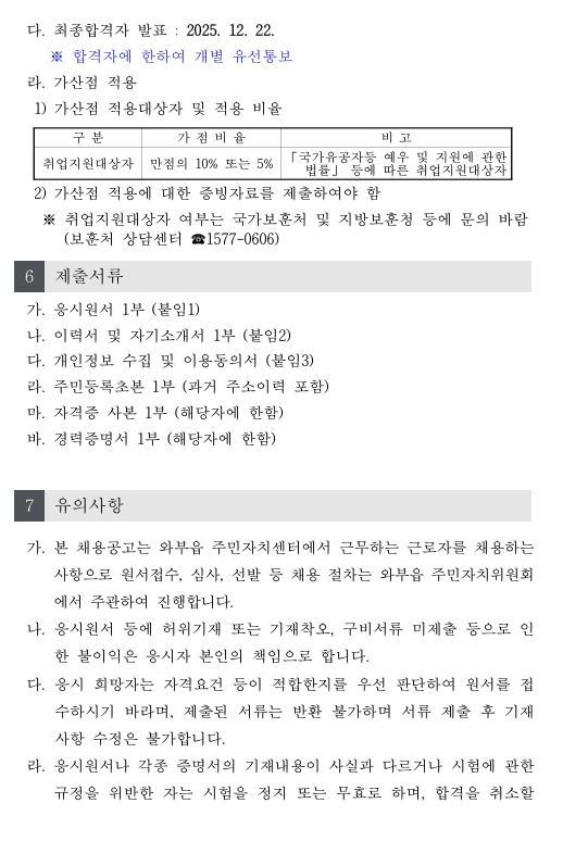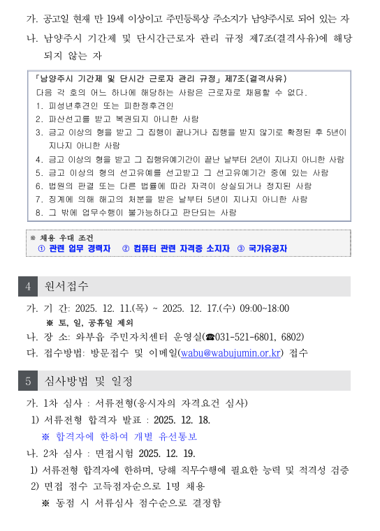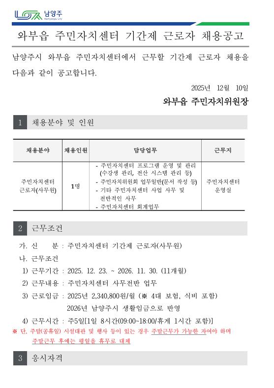 2025년 와부읍주민자치센터 기간제 근로자(행정 사무원) 채용공고