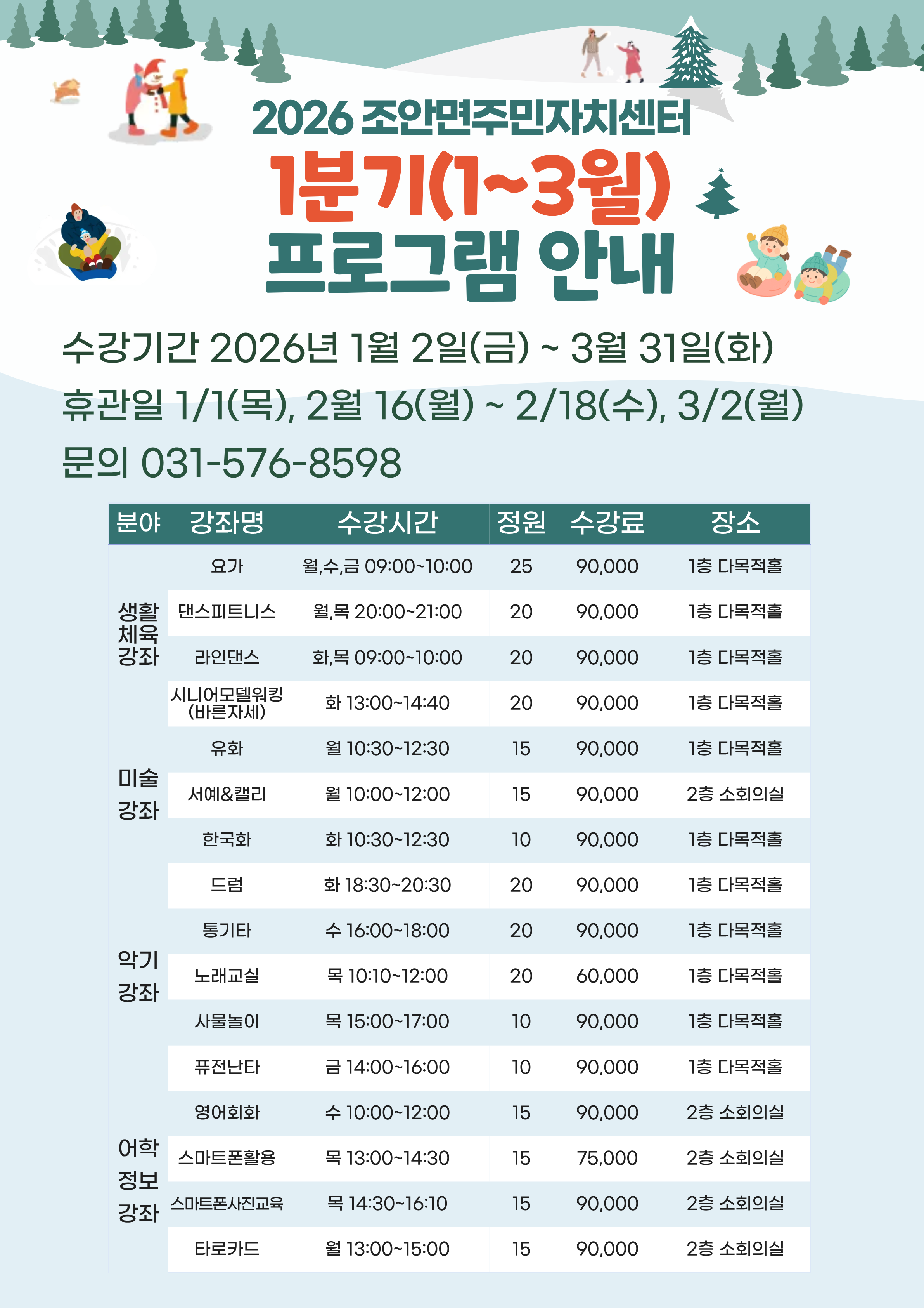 2026년 1분기(1월~3월) 조안면 주민자치센터 프로그램 수강생 모집